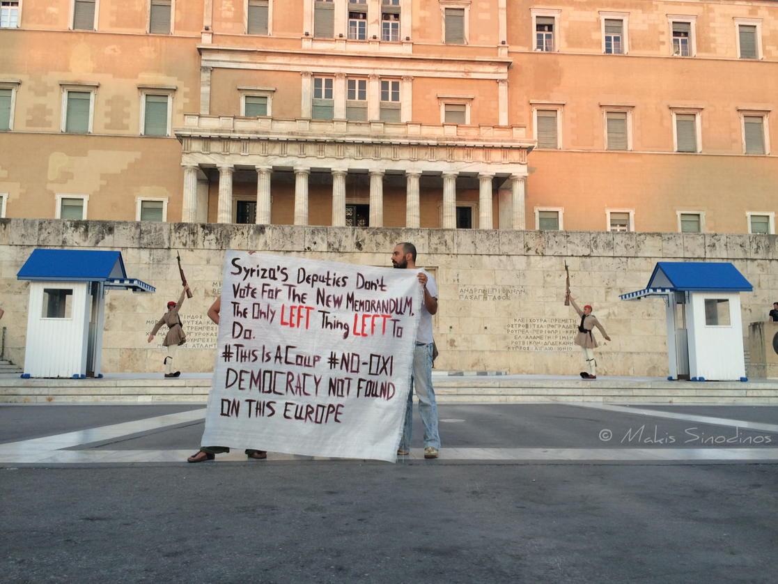 ΑΔΕΔΥ, ΑΝΤΑΡΣΥΑ, η Νεολαία ΣΥΡΙΖΑ, οργανώσεις και πρωτοβάθμια σωματεία, ενώθηκαν μόλις μερικές ώρες μετά την επίτευξη συμφωνίας με τους θεσμούς και συγκεντρώθηκαν στο Σύνταγμα, διαδηλώνοντας κατά των μέτρων που θα επακολουθήσουν, τα οποία από ομάδα αναλυτών, οικονομολόγων και εργατικών εκπροσώπων, χαρακτηρίζονται υφεσιακά, που θα οδηγήσουν στην ανεργία χιλιάδες εργαζόμενους και στον πλήρη αφανισμό την μικρομεσαία επιχείρηση.